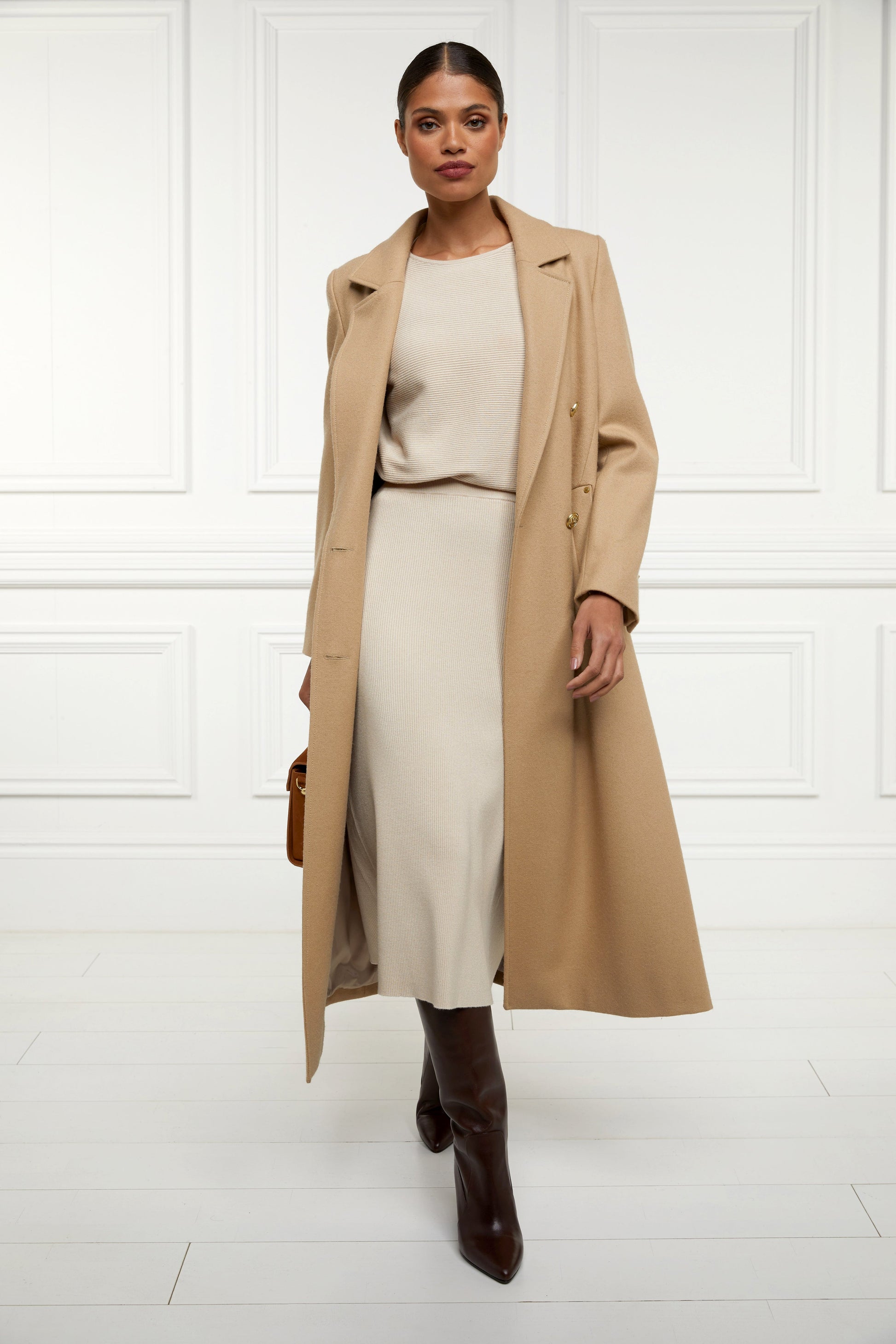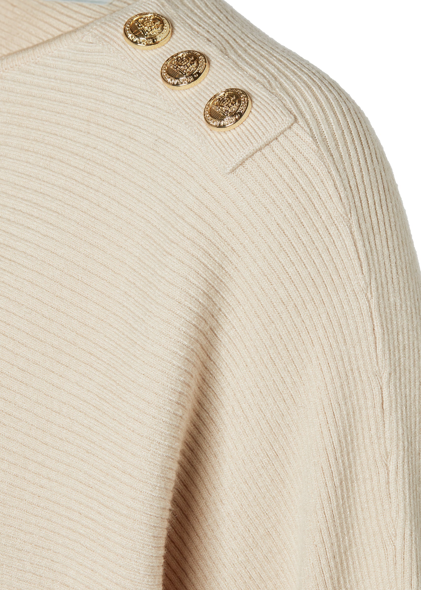 The Leyla Knit is a sophisticated staple, featuring a boat neck and batwing sleeves for a relaxed, yet elegant silhouette. The horizontal ribbed texture on the main body is complemented by a deep ribbed waistband, creating a flattering fit. Signature hardware on the shoulders and cuffs adds a refined touch, making this knit a perfect blend of comfort and style.