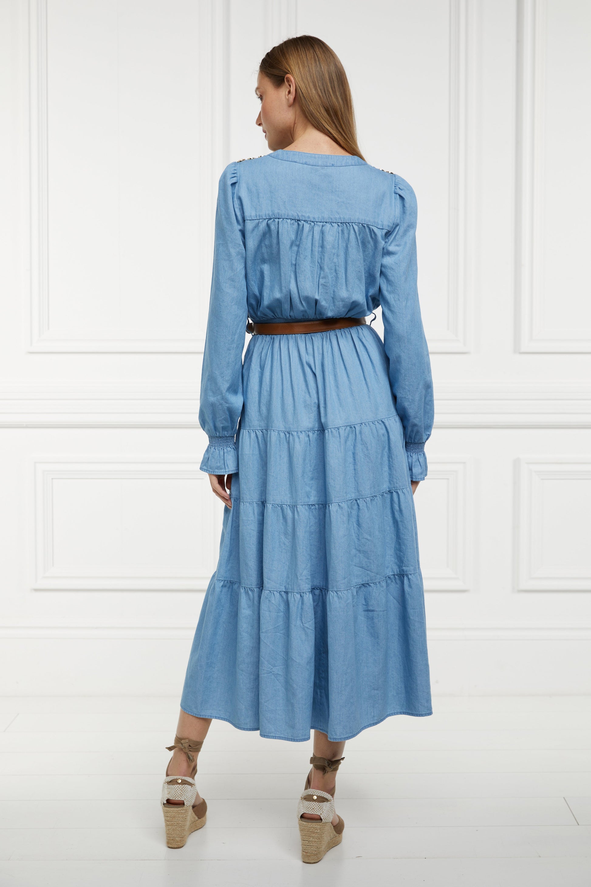 Made from 100% Cotton, this dress boasts a feminine tiered maxi-length skirt. The full-shirred waist detail ensures a perfect and comfortable fit. The shoulder placket features signature gold rivets, complemented by feminine sleeves adorned with shirred cuff details and a small fluted trim. The dress is beautifully finished with gold signature hardware.
