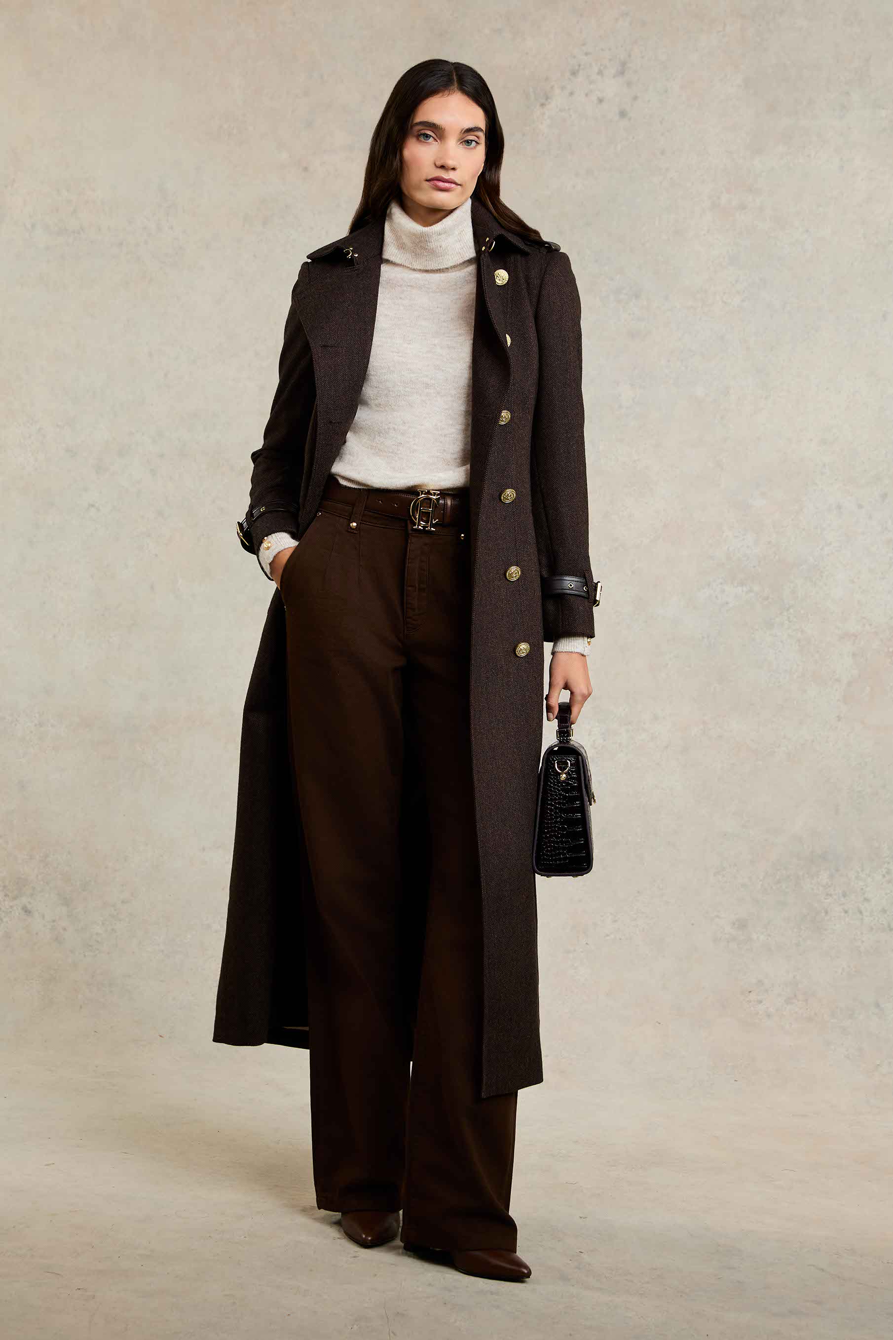 Crafted from a soft mohair blend, this lightweight yarn offers exceptional comfort and warmth. The design features elegant raglan full sleeves, providing a relaxed yet sophisticated silhouette. Enhanced with a gold HC detail on the roll neck and matte gold rivets on the cuffs, this knit combines effortless style with chic, understated elegance.