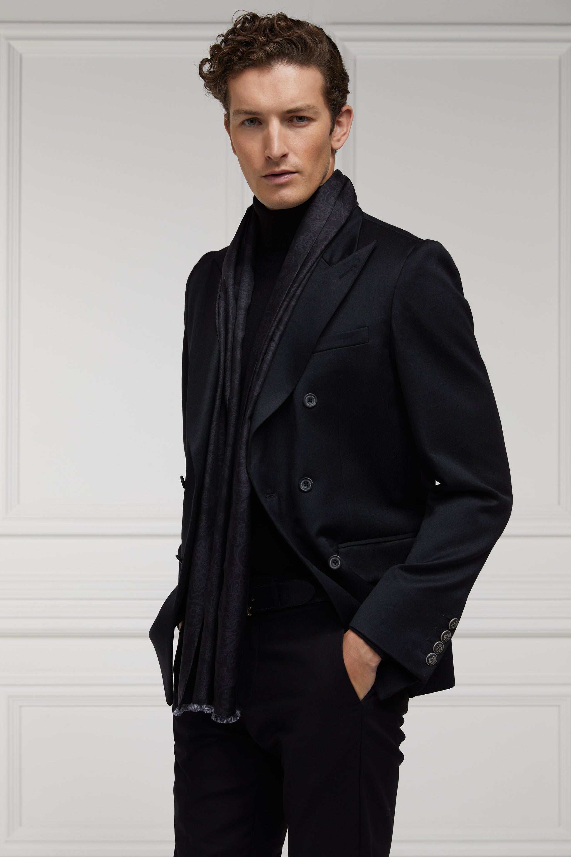 Expertly made in the UK from 100% silk, our first men's scarf has been designed with a traditional and intricate paisley motif showcasing a classic and timeless era of menswear. Finished with long fringed ends, each scarf has been meticulously crafted and finished by hand, ensuring each one is a unique piece of art. Designed to be a versatile accessory in every man's wardrobe, this scarf wears perfectly with our Cheltenham Coat for an elevated and contemporary look. You could also pair with an evening suit for a timeless and distinguished ensemble.