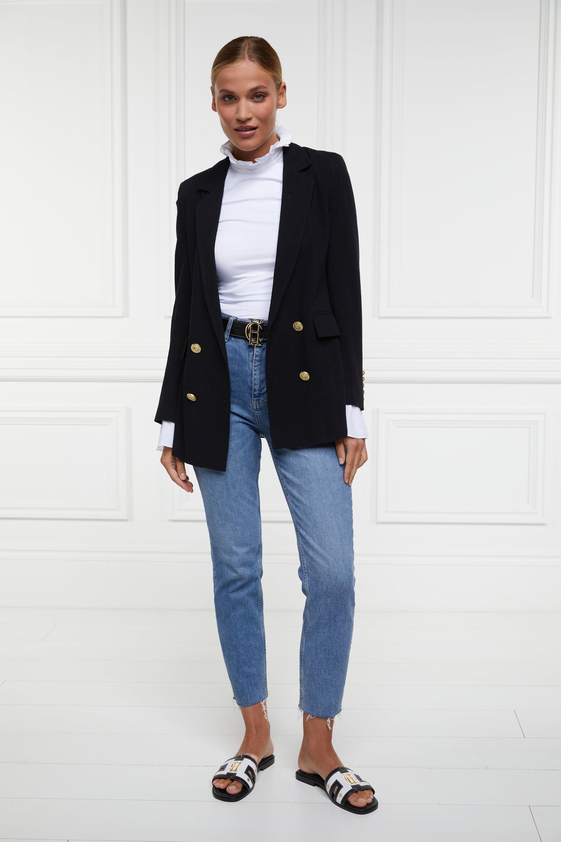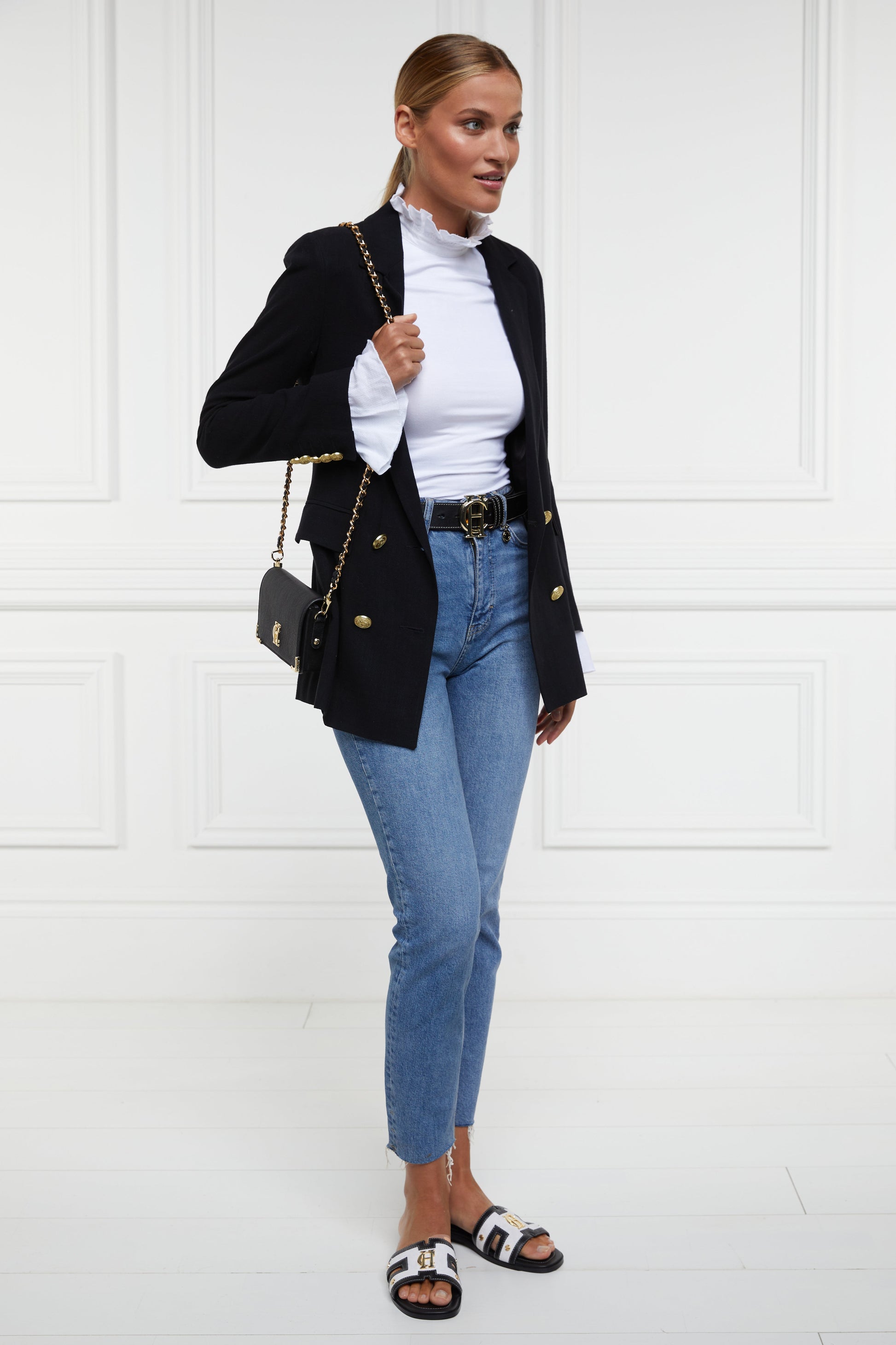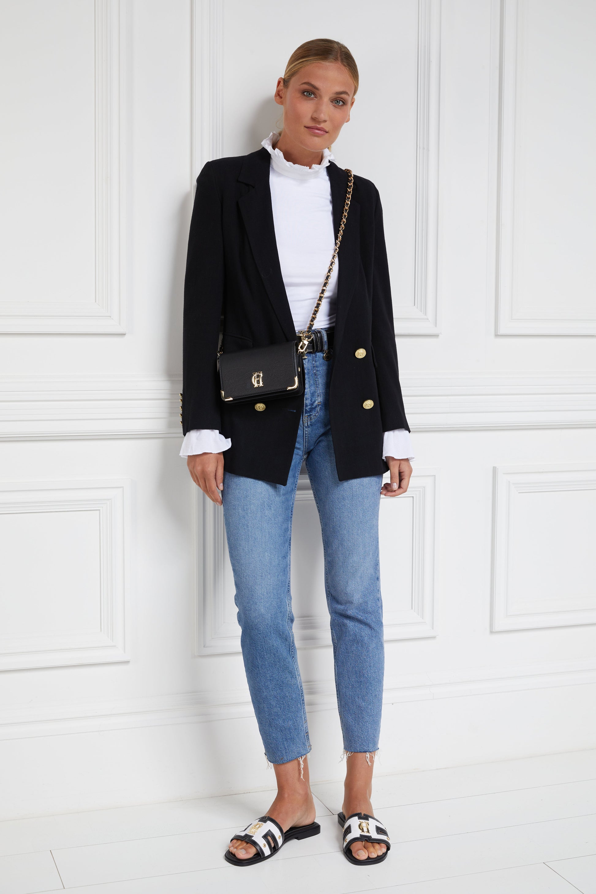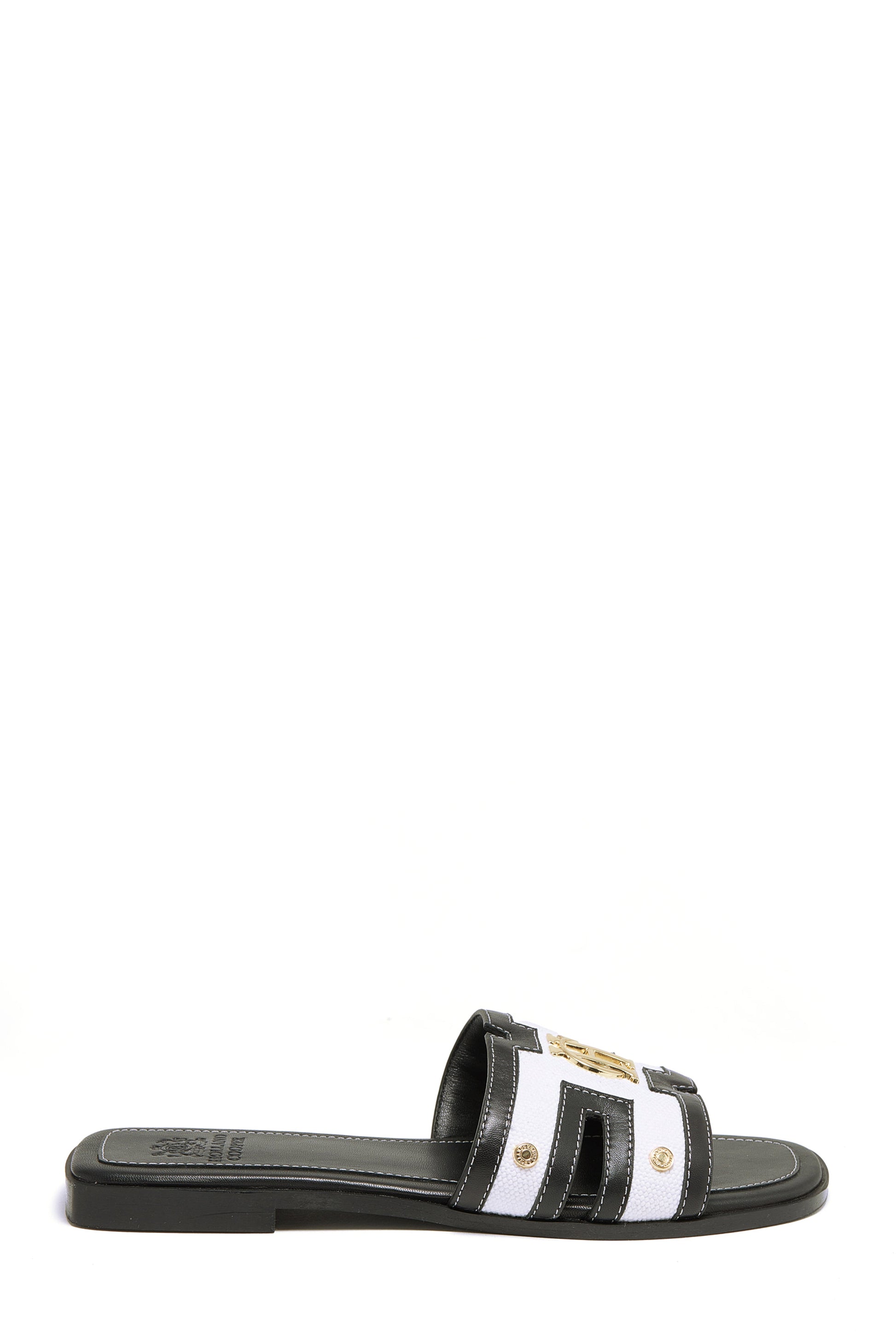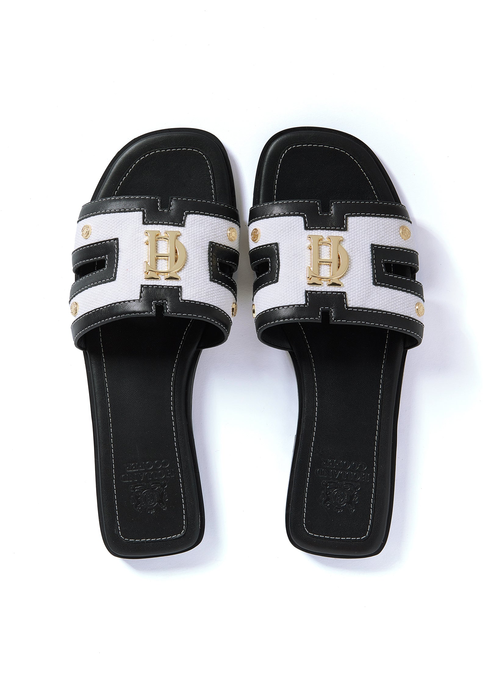 Designed with a cushioned sole for comfort with a soft leather & contrasting canvas strap. With eye catching cut out detail, this slide is adorned with our signature HC Monogram and gold rivets.
