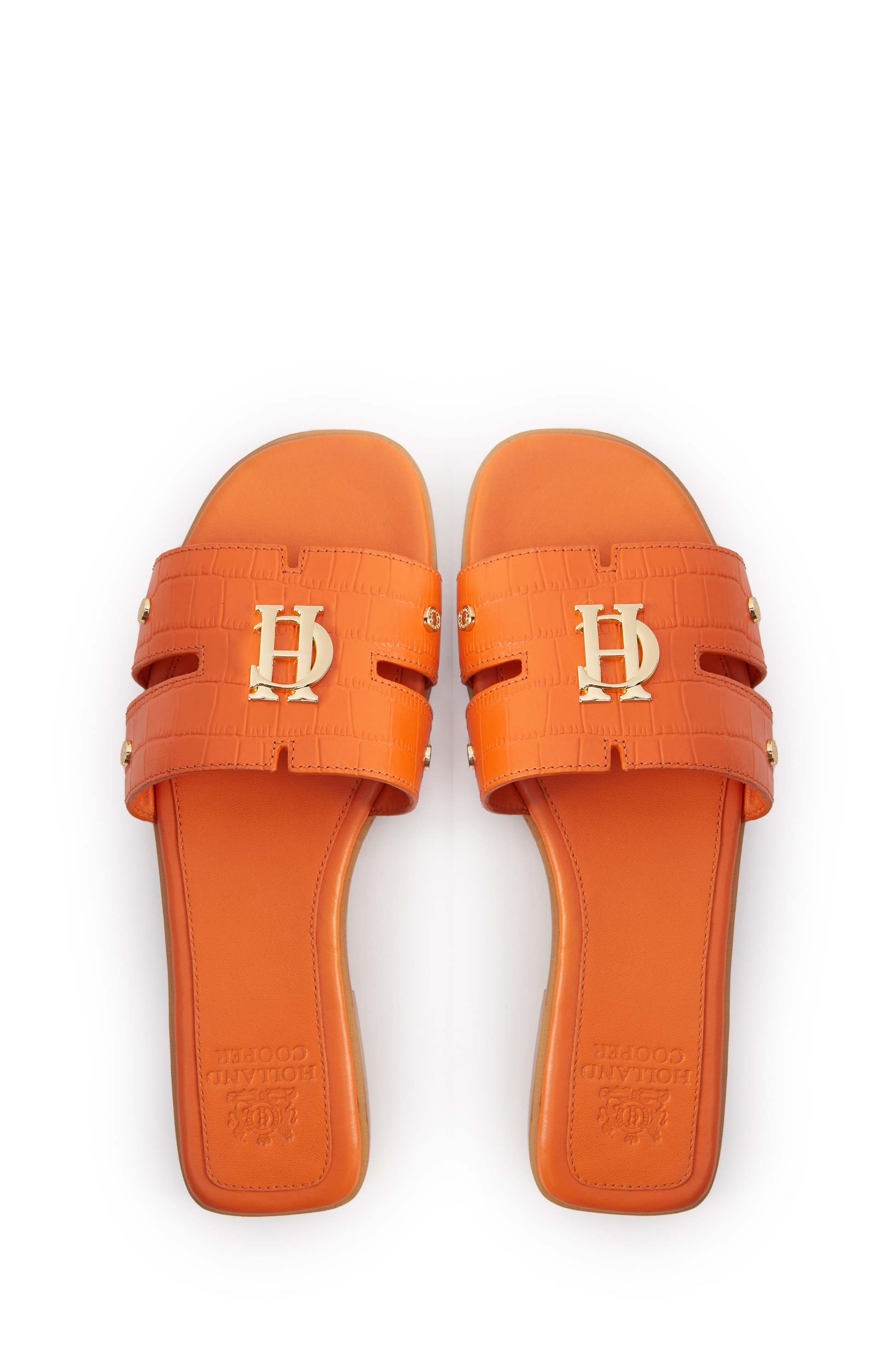 Meet our new shade of Monogram Slides, Orange Croc, the perfect accompaniment for summer. Designed with a cushioned sole for comfort, soft leather strap and eye catching cut out detail. This slide is adorned with our signature HC Monogram and gold rivets.
