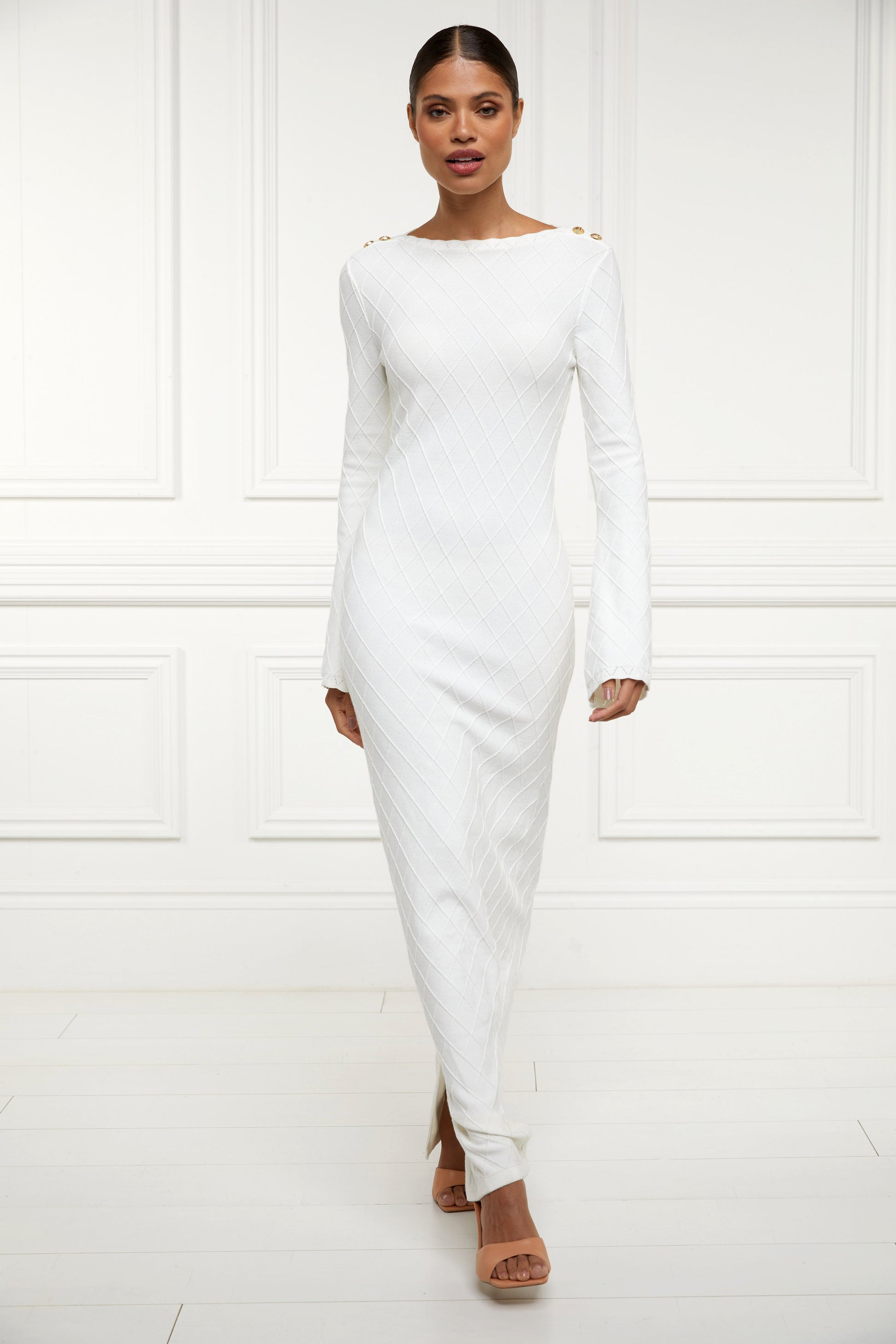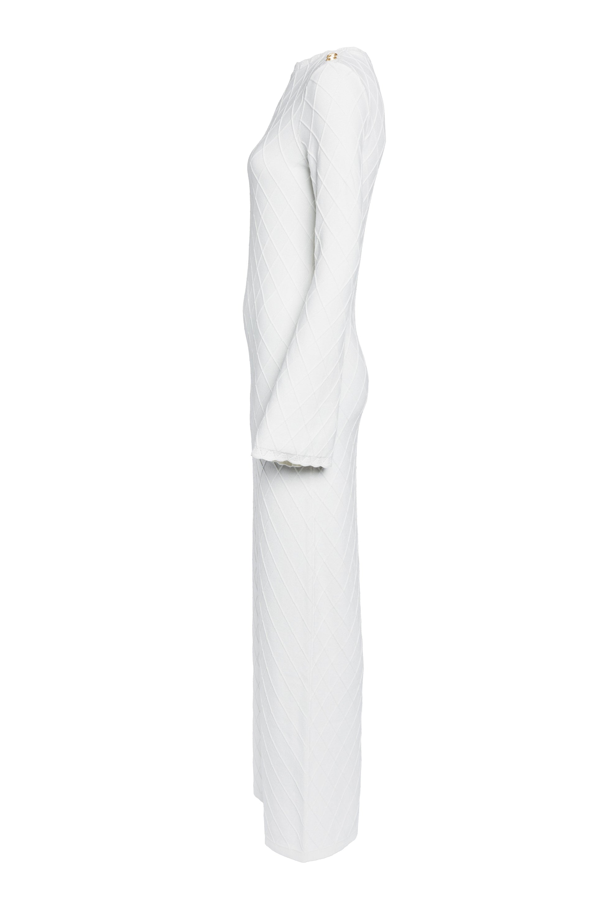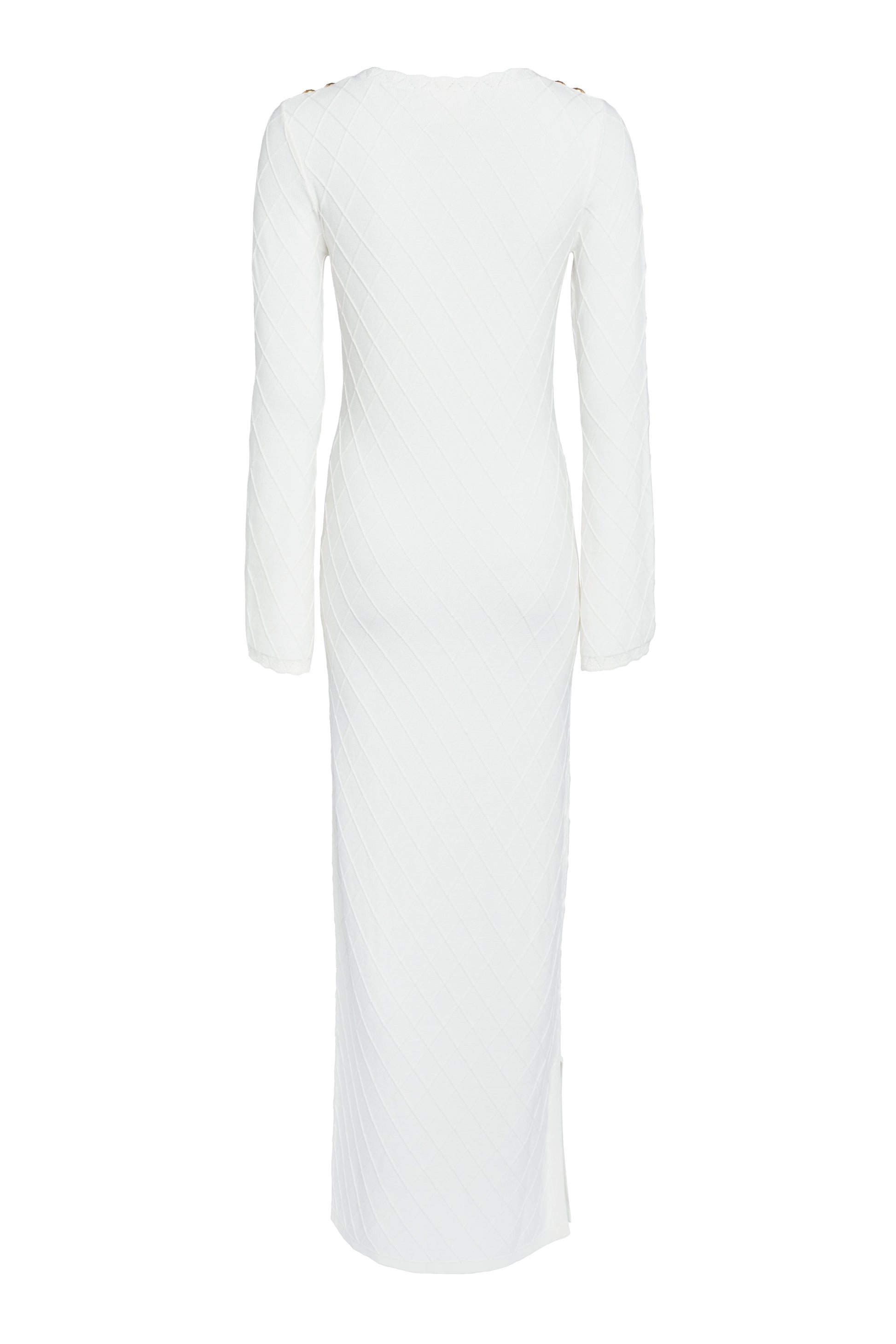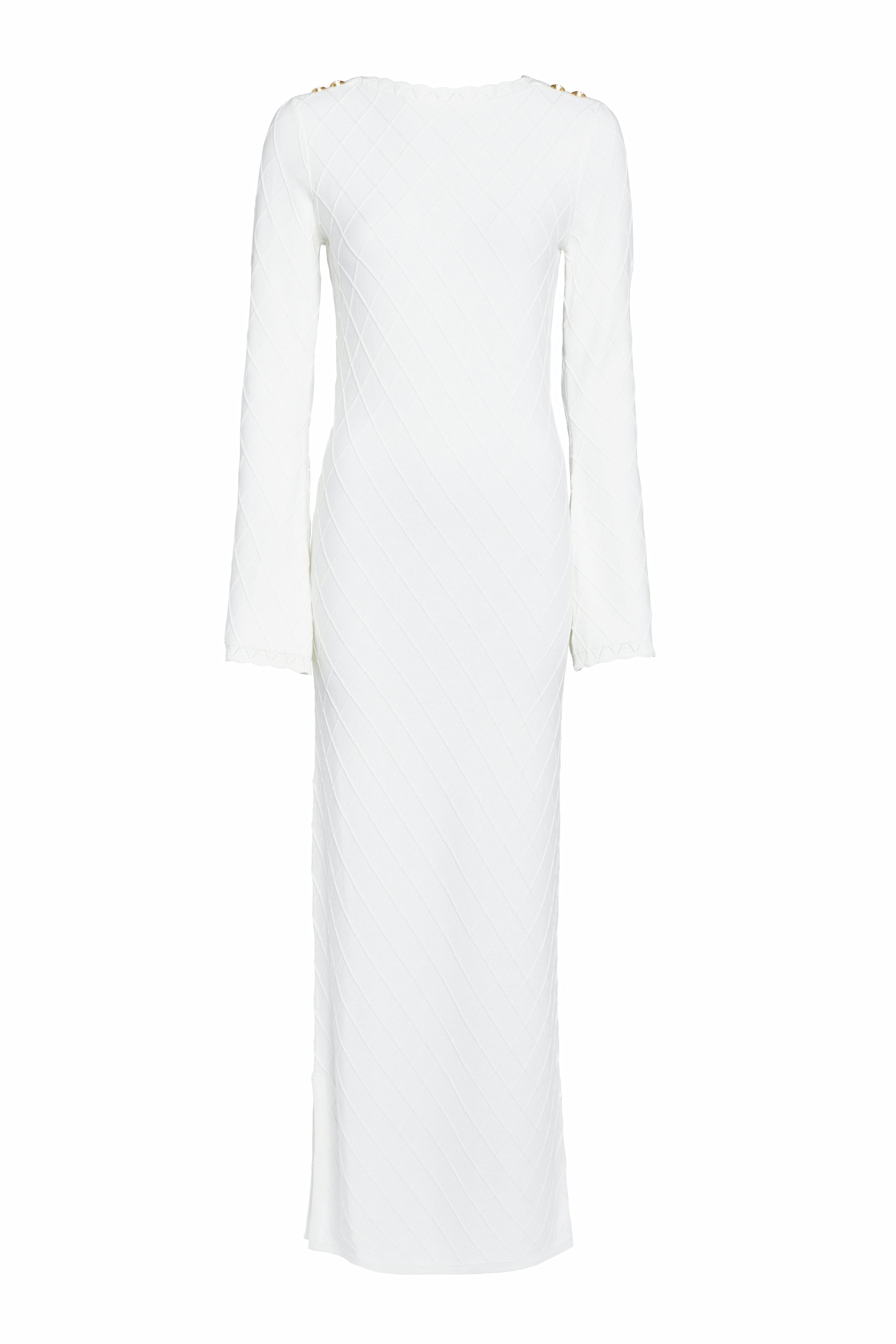 Elegantly crafted from a soft cotton fabric with a diamond pointelle pattern, this summer essential has been designed with a slim-fitting, maxi-length silhouette. With kimono-style sleeves that effortlessly complement this modern aesthetic, this dress has been beautifully finished with a touch of femininity through scalloped edging and a scoop neckline.
