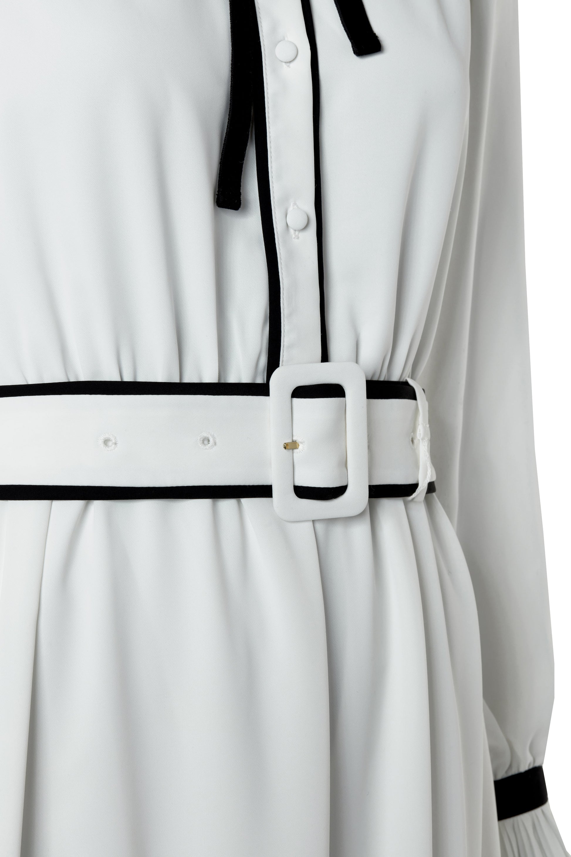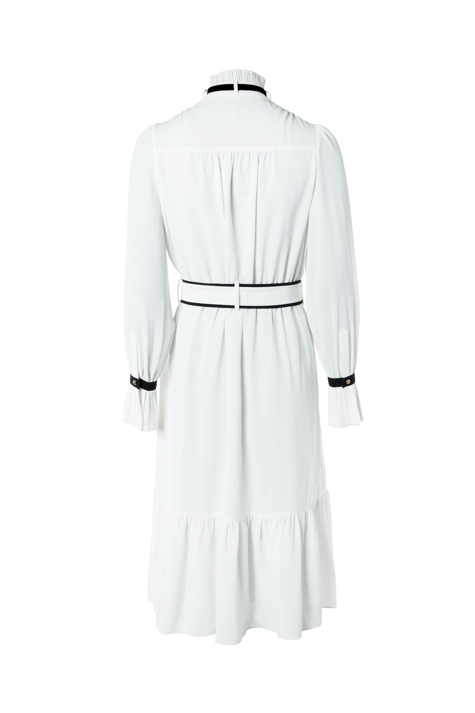 With its relaxed yet tailored fit, this dress exudes timeless charm. The midi length, tiered upper detail and detachable self-fabric belt creates a flattering silhouette ensuring you look effortlessly chic. The luxurious removable velvet tie around the collar and our signature HC gold hardware on the cuffs elevate the dress, adding an extra layer of refinement to your ensemble.