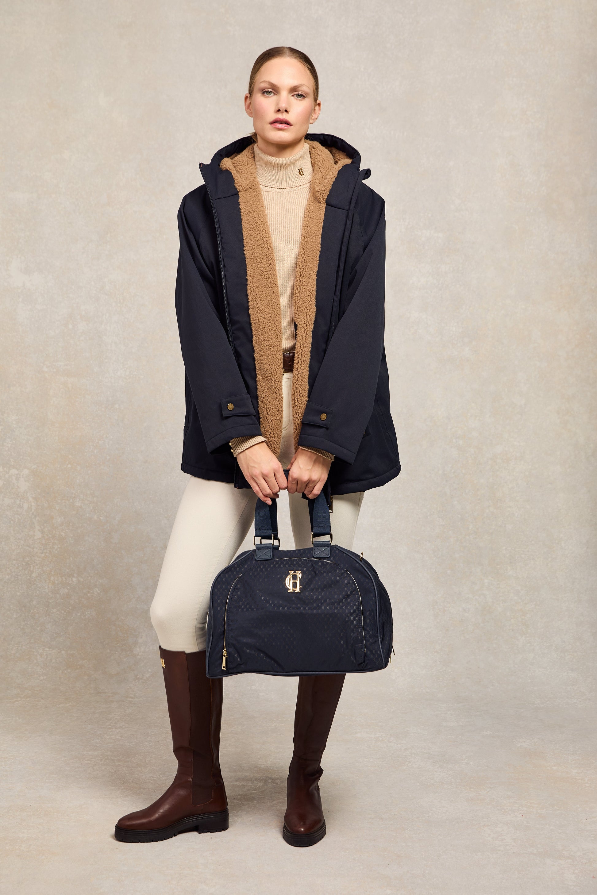 Thoughtful details like the borg-lined hood, adjustable cuffs, and front welt pockets deliver comfort and practicality, while the faux leather piping adds a refined finish.