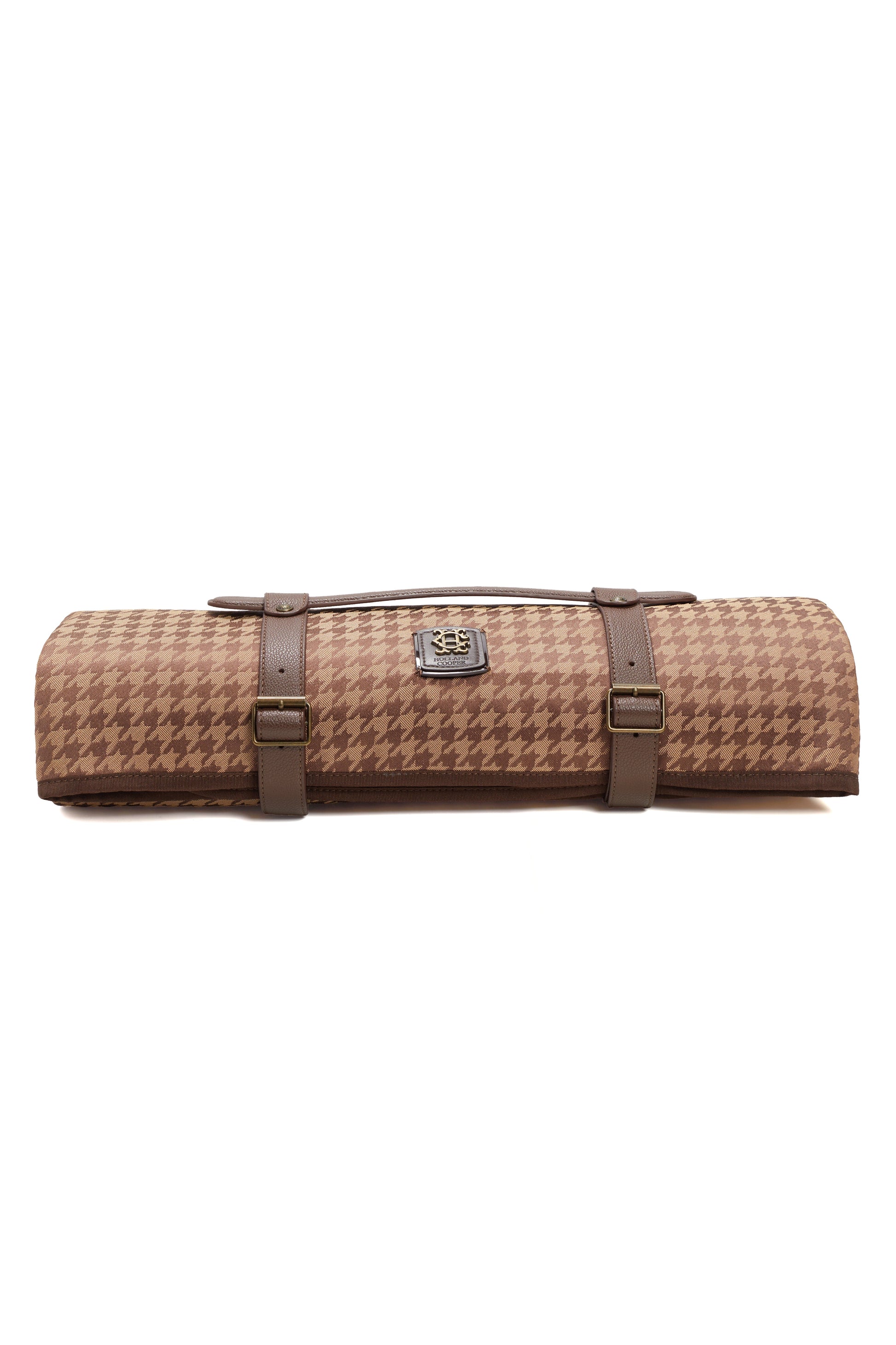 Our first-ever picnic blanket has been developed to be both stylish and practical. Crafted from a hardwearing, houndstooth Jacquard fabric with a waterproof membrane to the underside, the soft polypill lining ensures you can sit comfortably. Finished with faux leather carry straps which have been detailed with our iconic hardware. With an anti-stain finish, this picnic blanket ensures easy care, practicality and style when picnicking this summer.