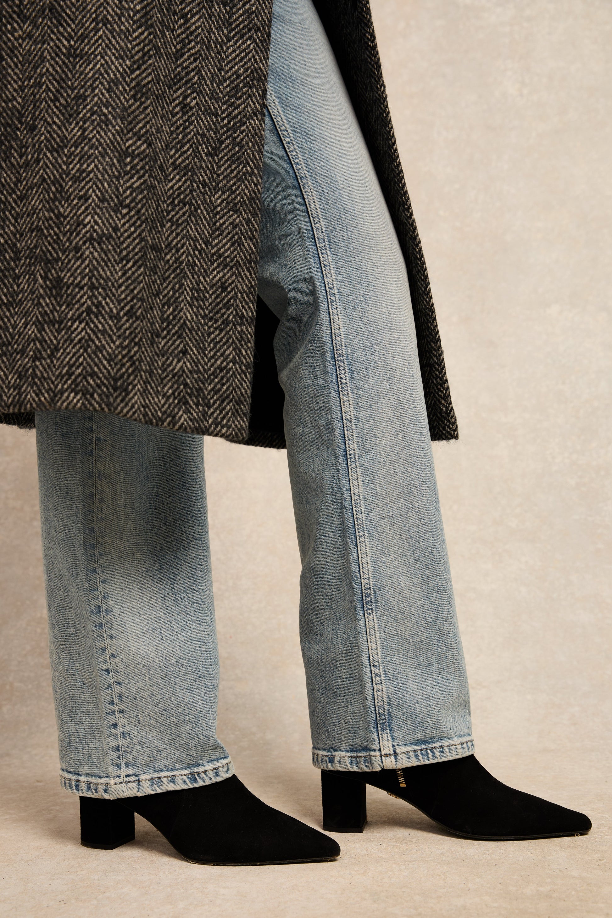 This miracle boot is designed for effortless elegance and all-day wear. Featuring the perfect heel height for both style and comfort, its refined block heel is wrapped in premium suede for a sophisticated finish. The sleek pointed toe enhances its timeless silhouette, adding a touch of sophistication to every step. The luxuriously soft leather lining ensures a plush feel, while the polished gold-tone zip closure adds a refined touch.