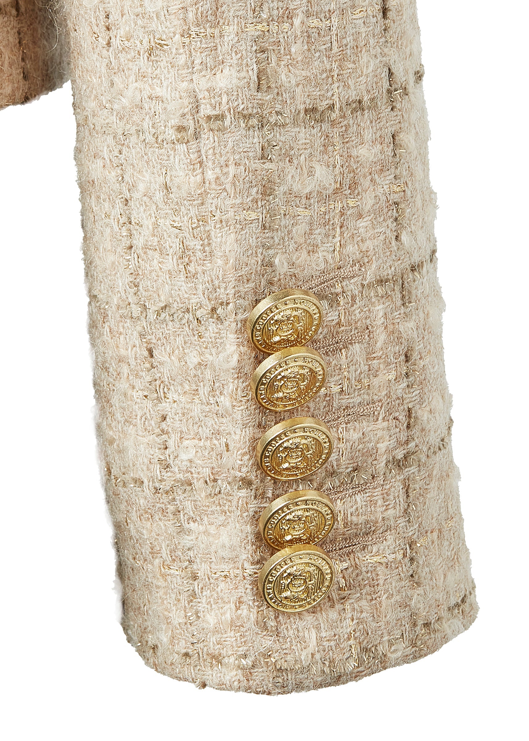 Elevate your wardrobe with this limited edition Boucle jacket. Featuring a slightly cropped, easy fit and articulated tailored sleeves, it combines comfort with elegance. The refined collar and lapel detail, along with 4-pocket styling, add to its sophisticated design. Finished with metallic details and Holland Cooper’s signature gold hardware, this jacket perfectly blends modern and vintage aesthetics.