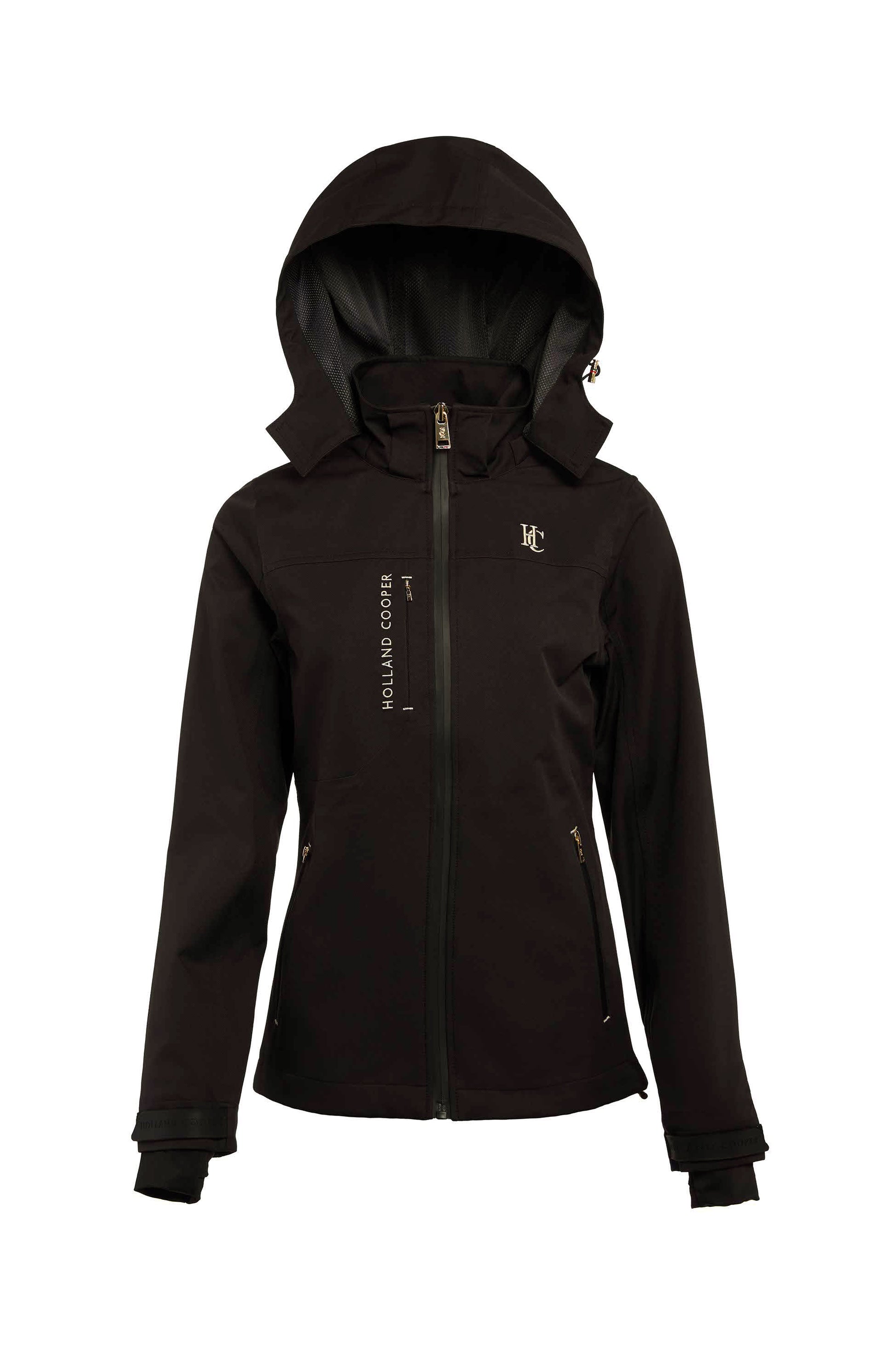 Crafted as a professional-level waterproof riding jacket, it features a high-denier fully waterproof shell fabric & stowaway hood. The taped and welded seams, along with waterproof zips, provide an additional layer of protection. Equipped with a front chest pocket for valuable storage and two large front pockets with soft-touch linings, this jacket seamlessly combines functionality with style. Finished with velcro storm cuffs and signature gold metal hardware.