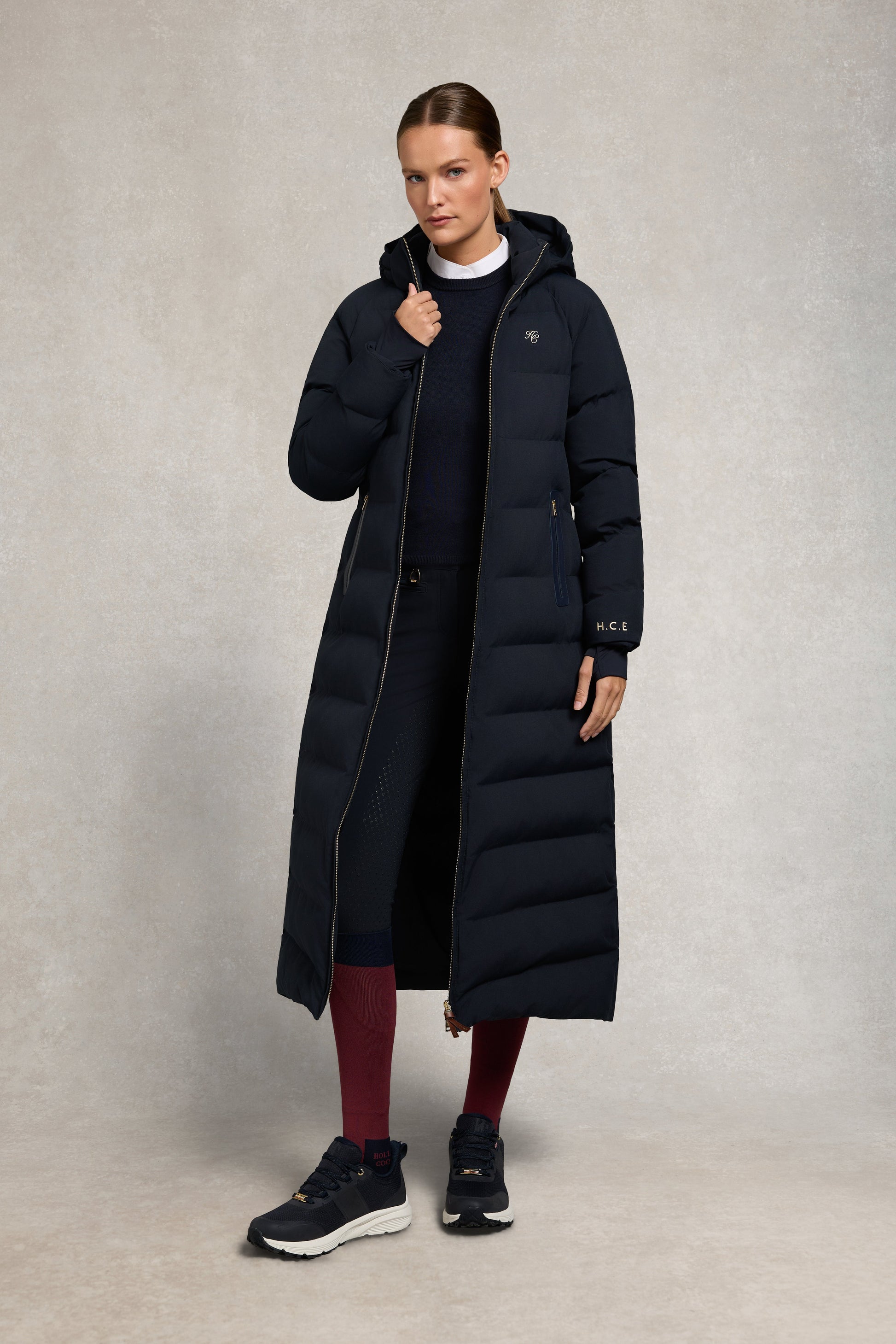 Designed with riders in mind, these knee-length socks are crafted from a super-stretchy, breathable fabric for a secure yet flexible fit. The reinforced footbed provides all-day comfort and durability, whether you're in the saddle or on the yard. Finished with signature HC branding, this elevated essential brings style and performance together seamlessly.