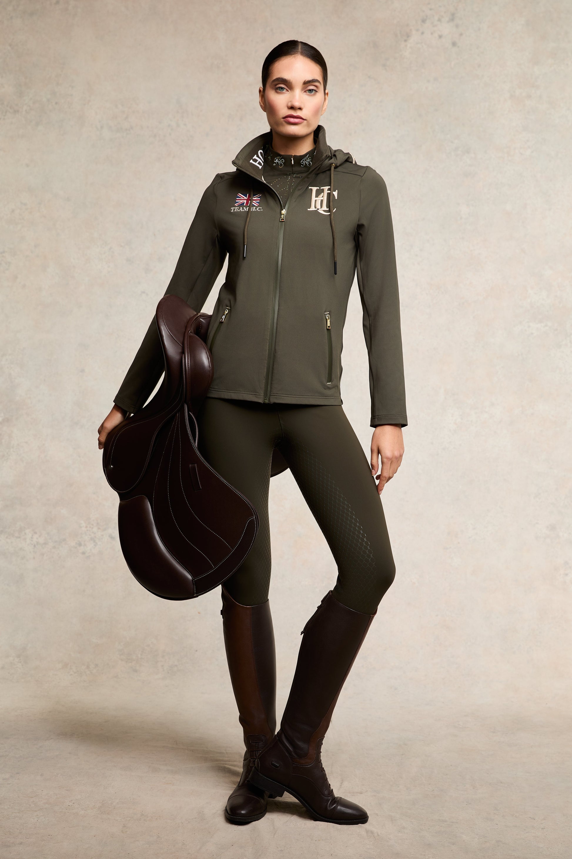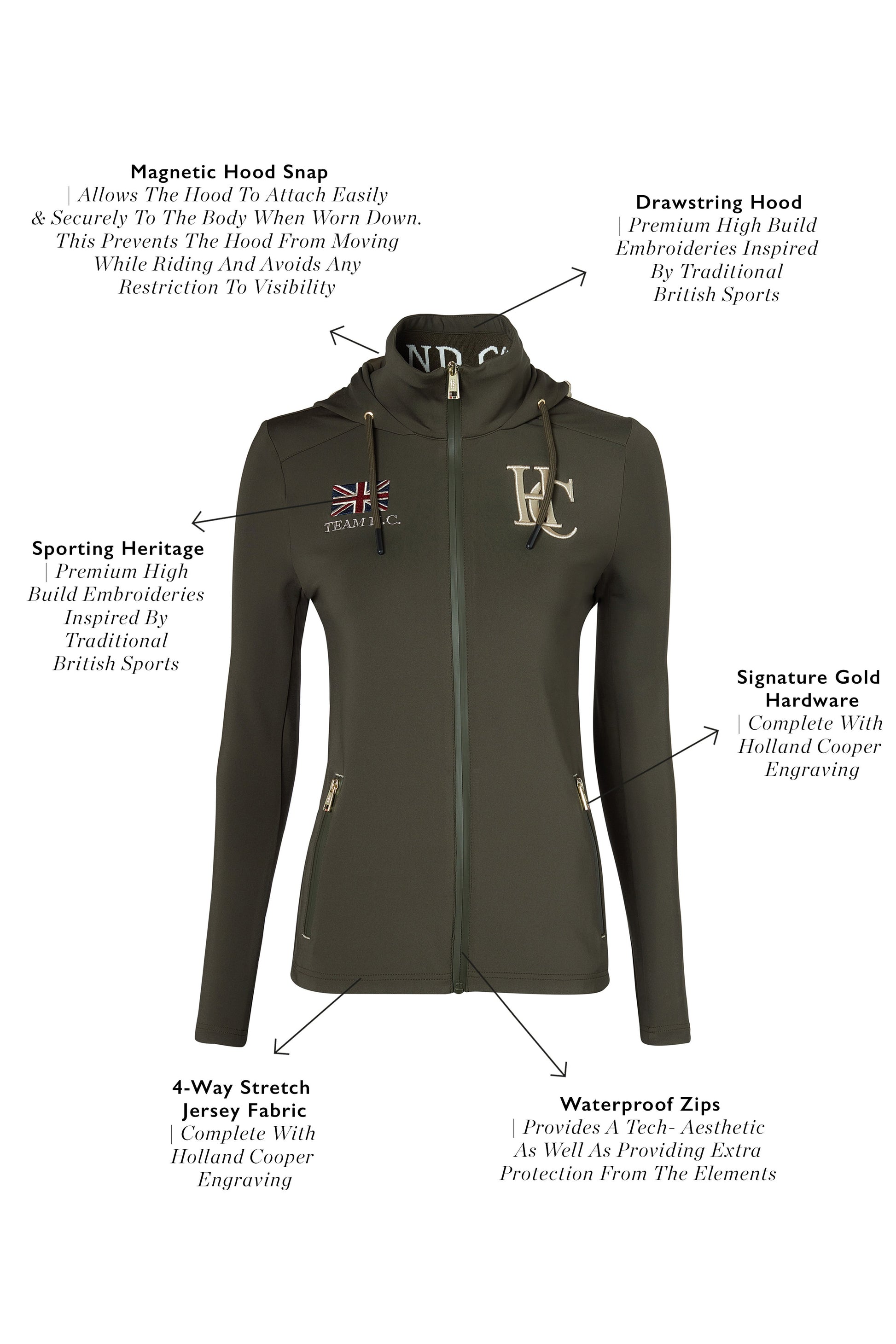 This super comfortable hooded riding jacket, designed for layering, offers a sleek and unlined construction for versatility in various weather conditions. Equipped with two large front pockets featuring waterproof zips and contrast bartacks. The close fit enhances both style and functionality, while high build embroideries on the front and back add a distinctive edge. Finished with a drawstring hood with magnetic pop down feature.