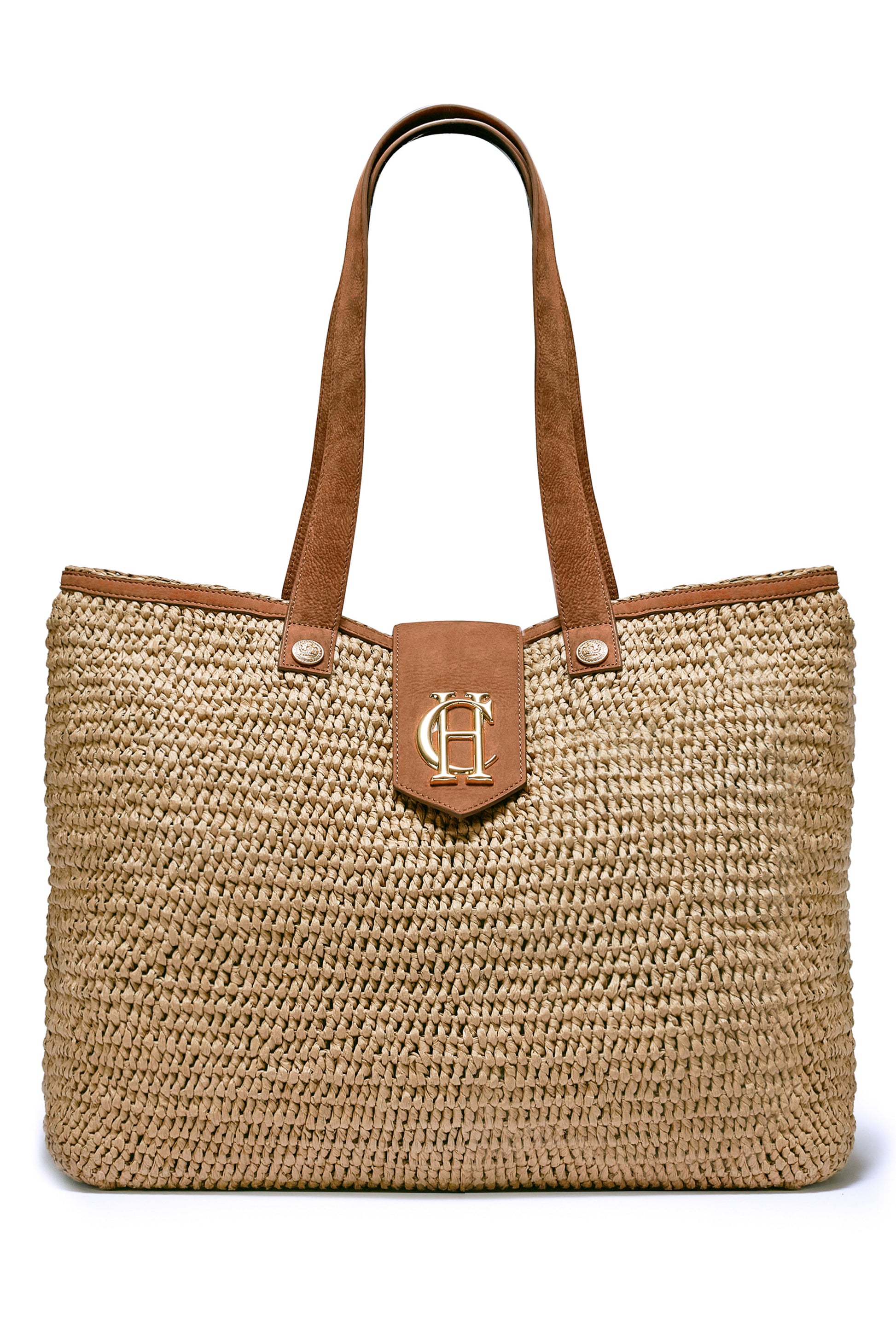 The perfect summer accessory, this straw tote has been designed with a basket shape for a classic and versatile style. Handwoven from lightweight natural rattan with an internal zip pocket and detailed with beautiful leather handles. Designed with a HC magnetic snap closure and finished with our iconic hardware, this bag is the perfect staple for your wardrobe.