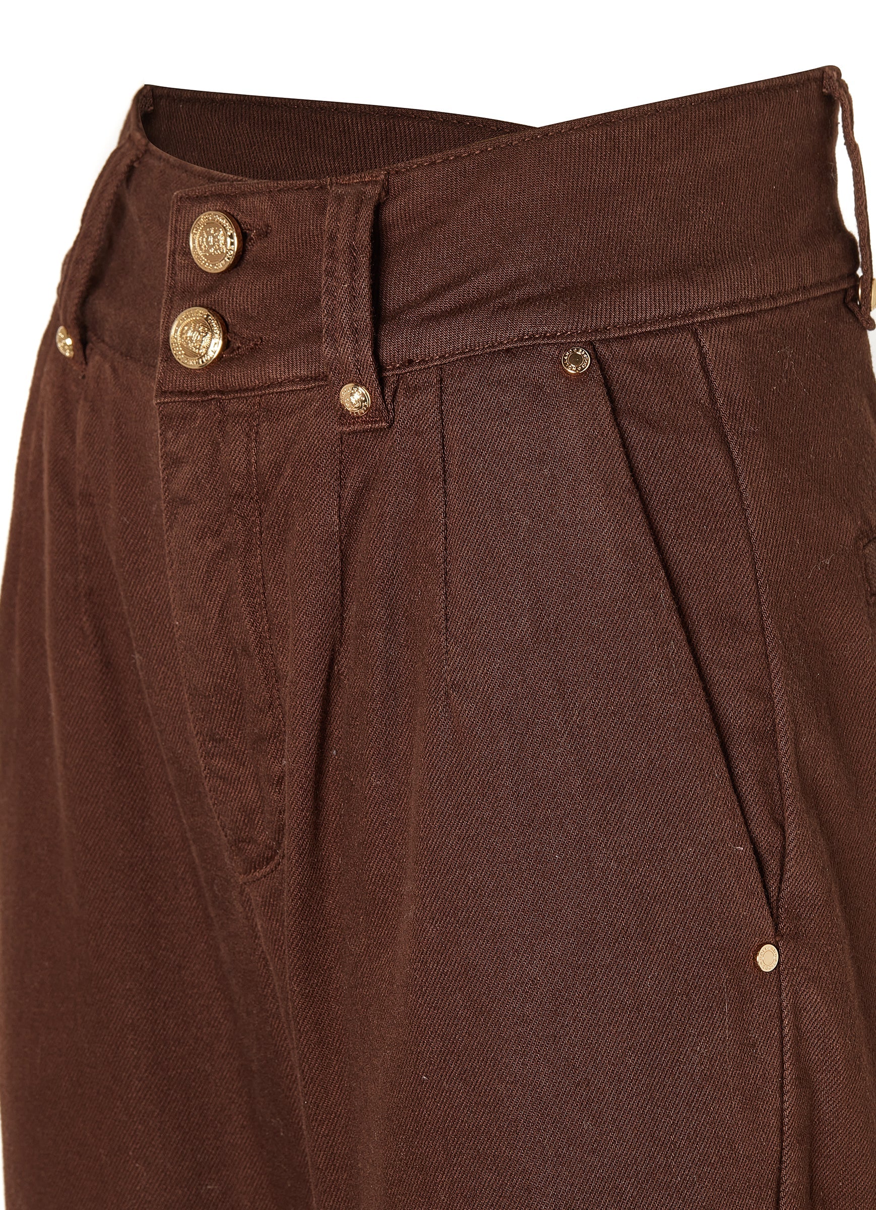 Elevated for the season, our jeans are a sophisticated update to your denim collection. Designed with the same shape as our iconic tailored trousers, these jeans feature a high-rise waist and a straight, loose-fit leg for a contemporary silhouette. The pleated fronts add a touch of volume, while the deep, flattering waistband ensures a sleek fit. Crafted from soft denim fabric, they offer both comfort and elegance. Adorned with signature shiny gold metal hardware, these jeans are designed to stand out.