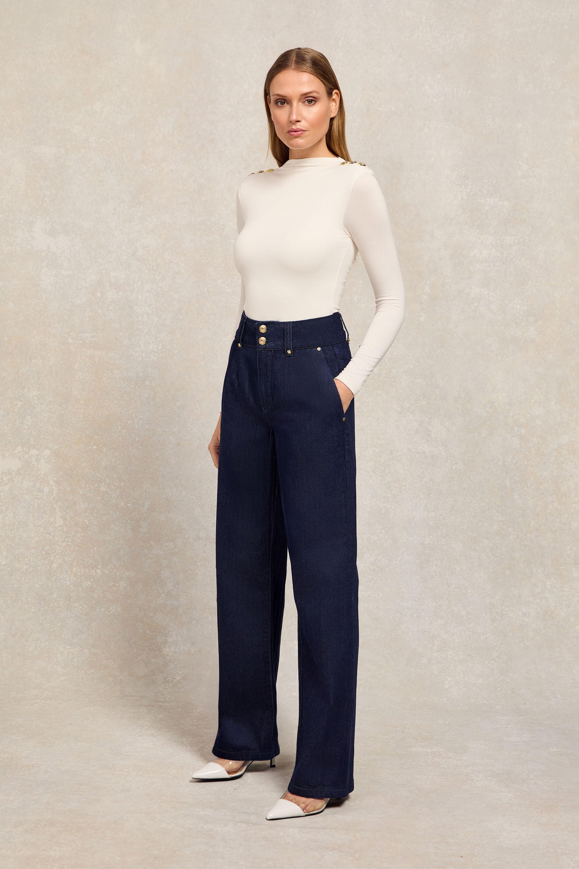 Simple and refined, these wide-leg jeans have been cut with the same silhouette as our iconic tailored trousers. Cut from soft denim with a high rise waist, the pleated fronts have been designed to create an elegant drape over the leg. Elevated with classic jean pockets and accentuated with our signature gold hardware, these jeans are the perfect combination of smart and casual.