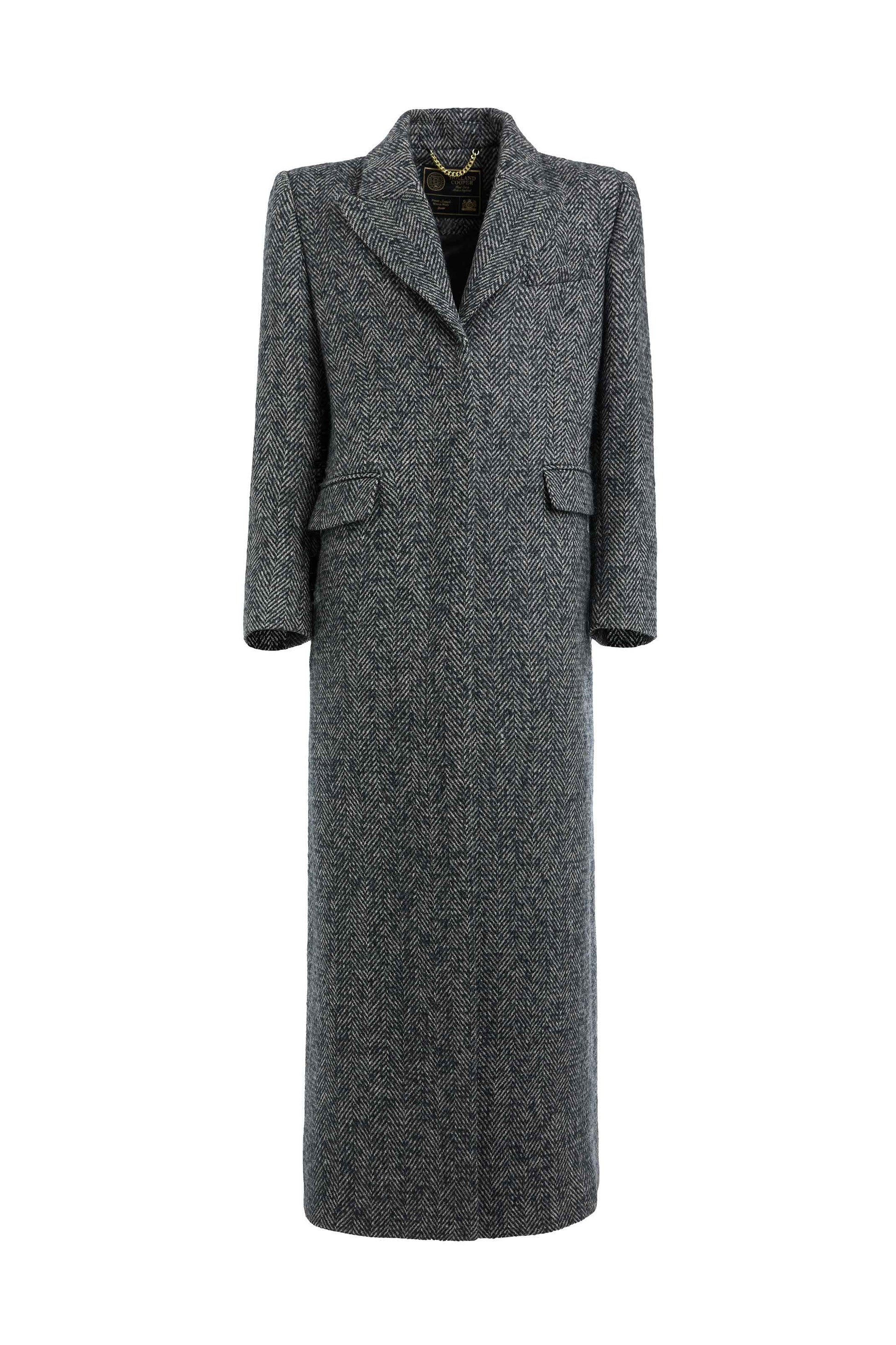 Crafted from pure wool herringbone fabric, the oversized, single-breasted Kelly Coat offers a relaxed calf-length silhouette with peak lapels and a vented back. A striking black leather collar stand and contrast leather piping elevate the fully lined interior, complete with two internal chest pockets.