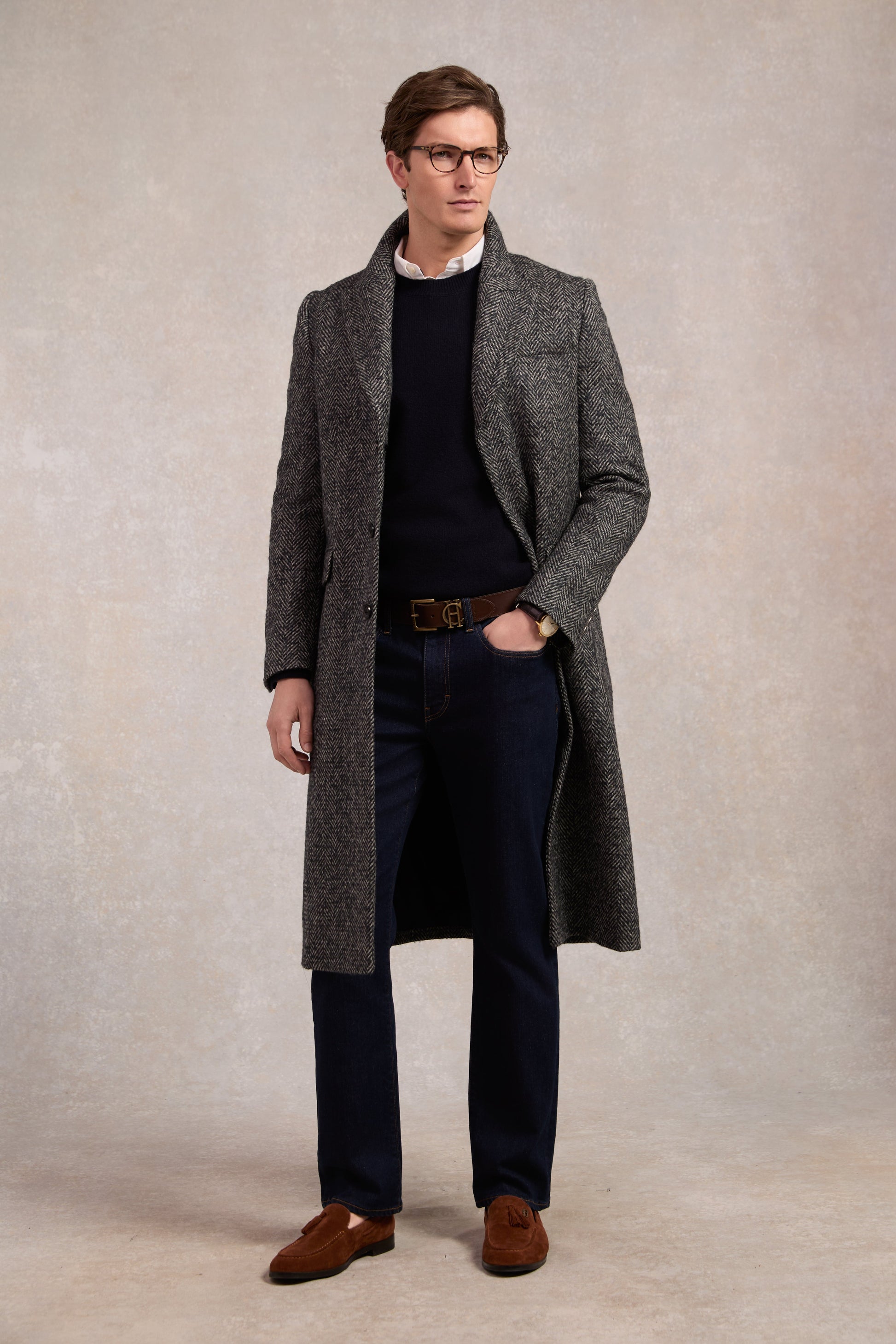 A refined take on classic tailoring, the Fairford Coat is crafted from pure wool herringbone, offering both warmth and timeless sophistication. The sleek, calf-length silhouette is elevated by peak lapels and a black leather collar stand, while a concealed button fastening ensures a clean, polished finish. Thoughtfully designed with a vented back for ease of movement, articulated sleeve openings with branded alloy buttons, and a fully lined interior with contrast leather-trimmed pockets, this coat is the perfect blend of heritage craftsmanship and modern elegance.