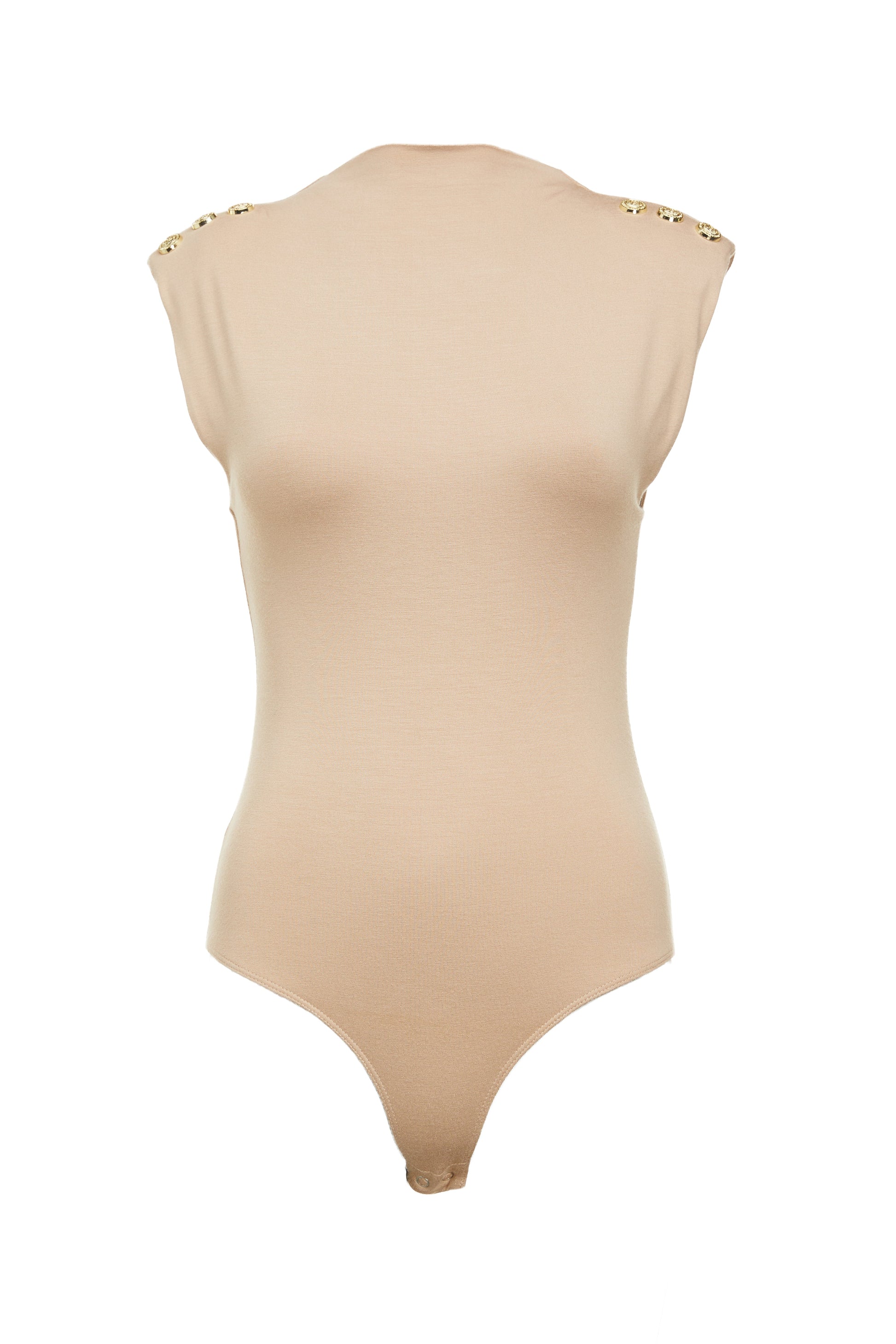 This capped sleeve bodysuit is a timeless classic. It gives you a sculpted tucked in look with a high neckline and light padding on the shoulder, featuring our signature HC gold hardware. Designed with a second skin feel, this soft stretch bodysuit has a flattering thong brief that will remain undetectable beneath close fitting tailoring or skirts.