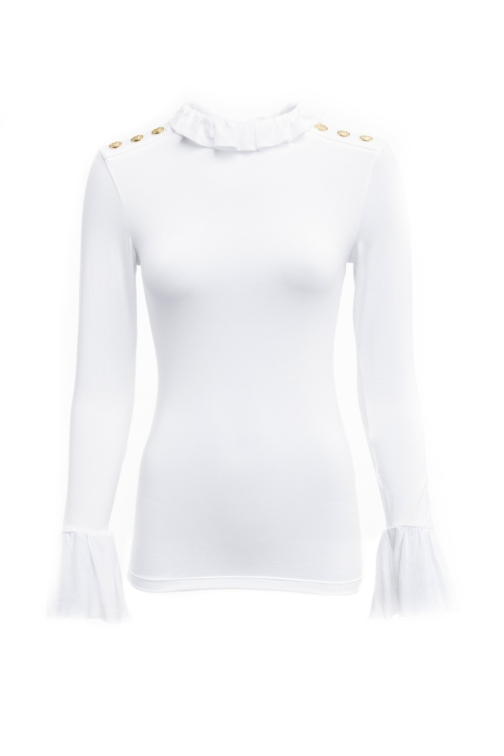 Created from a flawless and smooth fabric for a second-skin feel, this tee has been designed to become an everyday essential in your wardrobe. Designed with a body-contouring fit with a pretty ruffle neckline and cuffs, this piece is both flattering and elegant. Detailed with HC rivets on the shoulders.