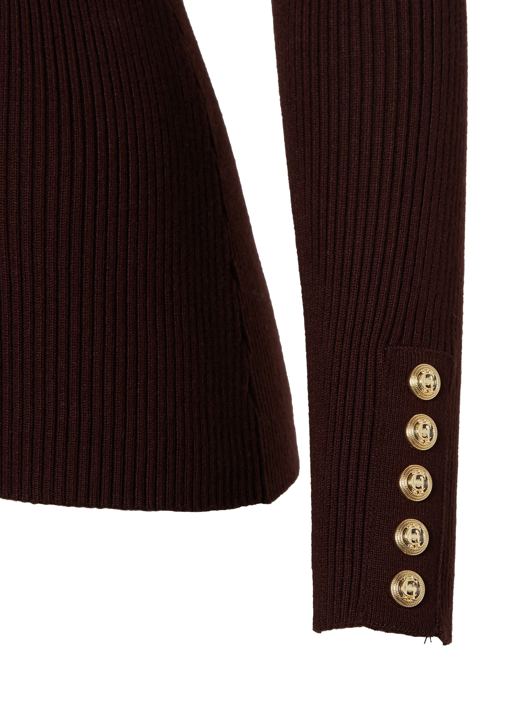A simple yet classic staple for any wardrobe. This slim fit ribbed knit top features elegant neck and collar detailing, offering a refined touch to your everyday wear. Designed with detachable shoulder pads for a customisable silhouette, it combines versatility with style. Signature metal gold hardware adds a hint of sophistication, making the V-Neck Rib Top an essential piece.