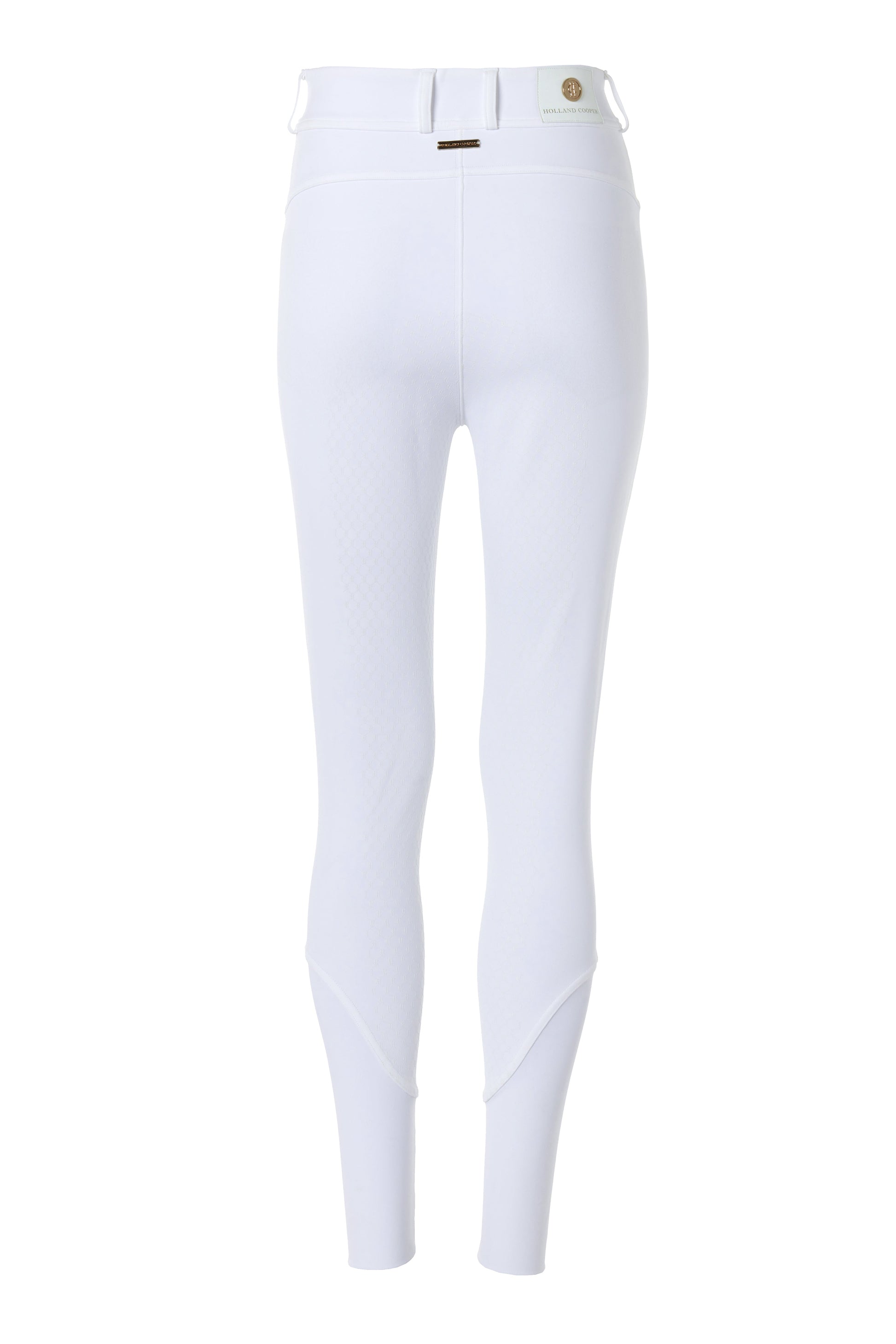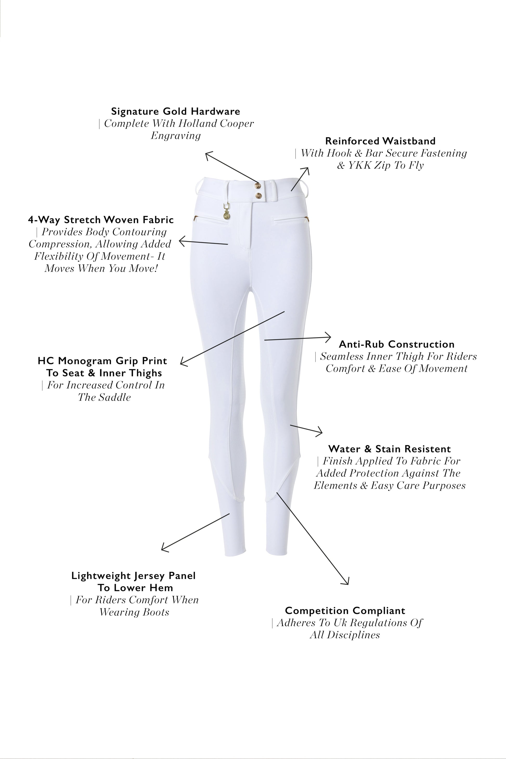 Crafted from a breathable and water-resistant four-way stretch fabric, these breeches provide unparalleled comfort and versatility, whilst adhering to GB competition regulations. Designed with a focus on performance, the elastic tape on the inner waist prevents the shirt from rising, ensuring a seamless experience. Designed with a monogram grip print to the seat & inner thigh for increased control in the saddle, these breeches have been detailed with our signature gold hardware and a branded charm attached.